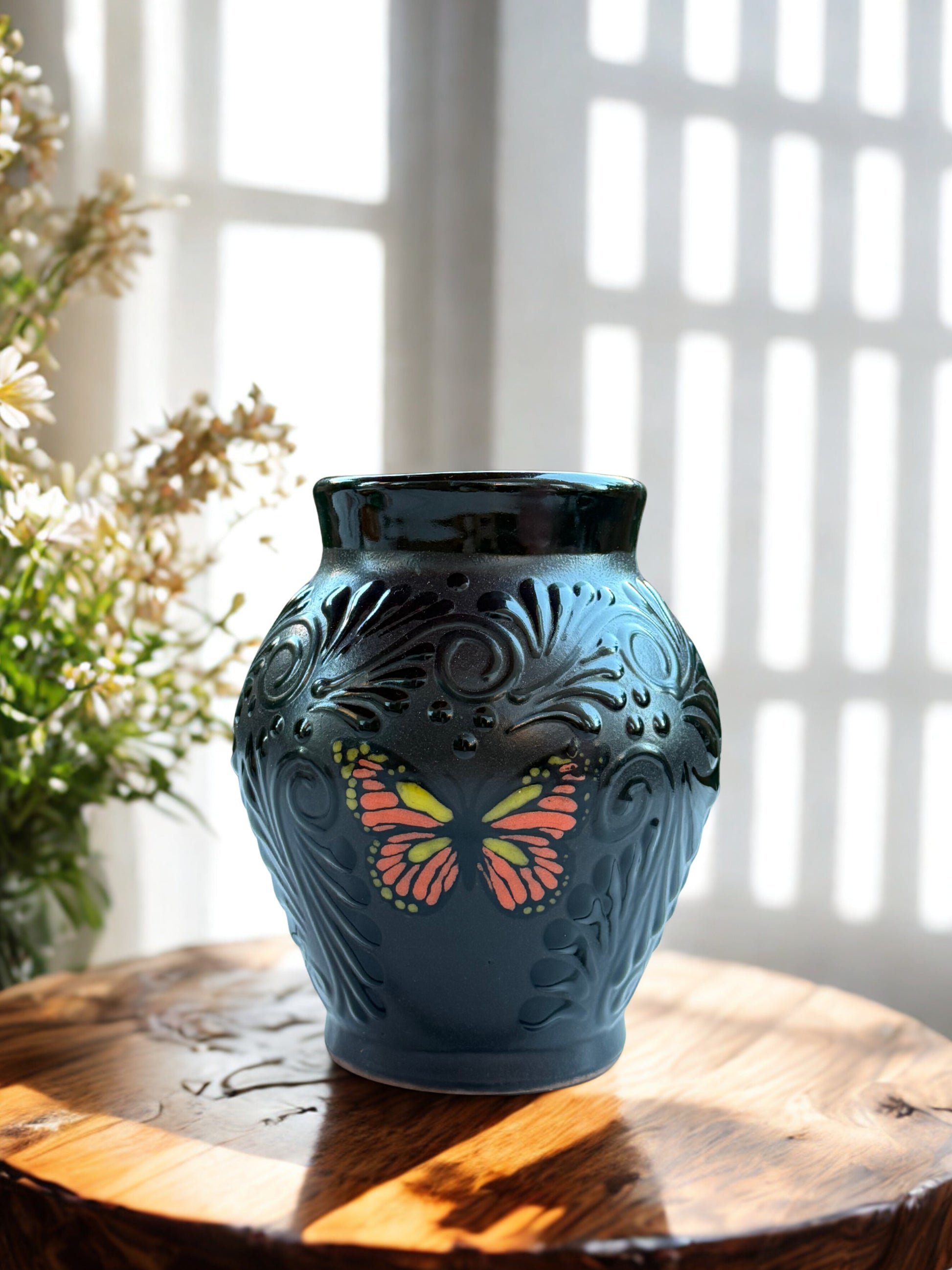 Black bulbous flower vase